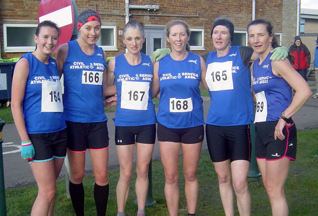 The victorious Civil Service women's squad at the 2015 event - (l-r) Megan Roberts (164), Natasha Sheel (166), race winner Katie Beecher (167), Jennifer Bradley (168), Sue Francis (165) and Stephanie Robson (169). Photo from Nick Hume.